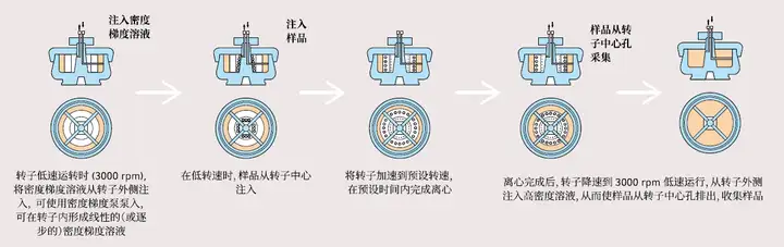 通過泵入較重的密度梯度液,使得轉子體內的液體從輕到重依次被擠出。通過收集不同的樣品,將樣品進行檢測后,確認目標樣品所在的區帶。